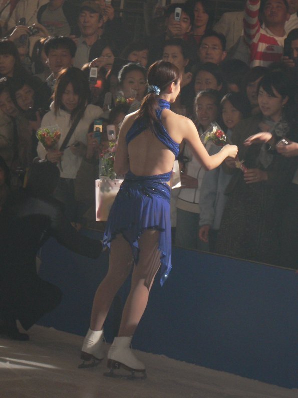 | 次は清美のレポート トリノオリンピックで朝早く起きて見たフィギア女子フリープログラム!荒川選手の優美でしなやか、流れるような演技にTVに釘付け、日本人離れした長身でスタイル、容貌とも美しい!日本唯一のメダル、涙腺がゆるみ放し。本当に素敵な演技でした。 是非とも彼女の演技を生で見たい!と何度もアイスショーのチケット争奪戦に参戦、三度目と言っても往復葉書、ネット、電話とあらゆる手段を用いてチケットをやっとこさ、ゲット。大津までは1時間くらいで行ける距離、そこに金メダリストが来てくれるとなれば絶対に行きたかったのです。 本物は色白で華奢、目がキラキラと印象的でした。トリノのエキシビジョンと同じユー・レイズ・ミーアップをしなやかに美しく舞ってくれました。すーと音も無く氷の上を滑って、ジャンプ、スパイラルのたびにワ〜!と大歓声、凄い人気でした。 フィナーレ、後ろからど〜と押されながらやっと、花束を渡し握手、柔らかく暖かい手、可愛い声で「ありがとうございます」と言ってくれました。フィナーレの演技後にあまりに沢山の花束をもらい続け、少し息切れしながら、汗が顔に浮かんでいました。最後の最後まで丁寧に握手しながら花束をもらってファンの希望をかなえてくれました。ありがとさん!!でした。 |