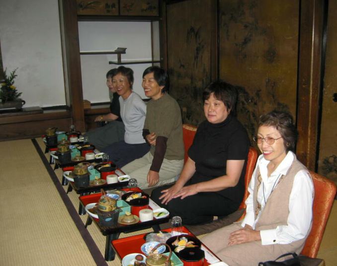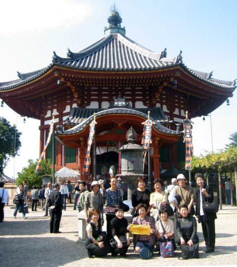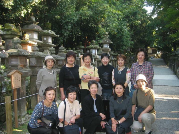 午前7時起床だが、皆早めに起きて露天風呂の『むささびの湯』に入ったり、付近を散歩したり、群芳園を散策する。8時前に朝食、部屋は昨晩と同じ山水の間。9時、駅まで送ってもらう前に女将さんと一緒に記念撮影。9時20分に特急電車に乗り奈良へ。橿原神宮、西大寺で乗り換え11時04分無事奈良到着。荷物を預け、歩いて興福寺まで行く。