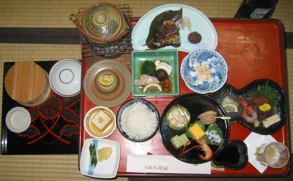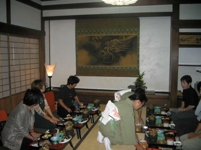 夕食は本館『山水の間』で一人一人台付きお膳で日本料理を頂く。山水に間は庭に面し、書院付き床の間には龍の掛け軸、襖にも絵が描かれ、これぞ日本の建築美と思わせる。皆さんこの部屋の素晴らしさに見とれ、口々すごい!夕食後は館内の売店で桜葛湯などの土産物を買い、温泉『かもしかの湯』で旅の疲れを癒す。