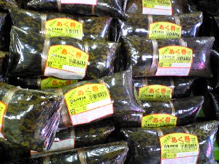 | 鹿児島の『あく巻』 2009/05/08UP ス−パ−の台に並んだ 鹿児島の「ちまき」です。 「あく巻」 辞書で調べてください。 欽也 写真有難うございます! 鹿児島ではこんなにして売られているんですね?節句だけでなく1年中売られているので、普通のおやつ感覚ですね?広辞苑には載ってませんでしたがネットで検索すると大昔から兵士の兵糧や保存食としてそれぞれの家の味を代々受け継いでいると書かれていました。作り方は真理ちゃんの教えてくれた通りです。 |